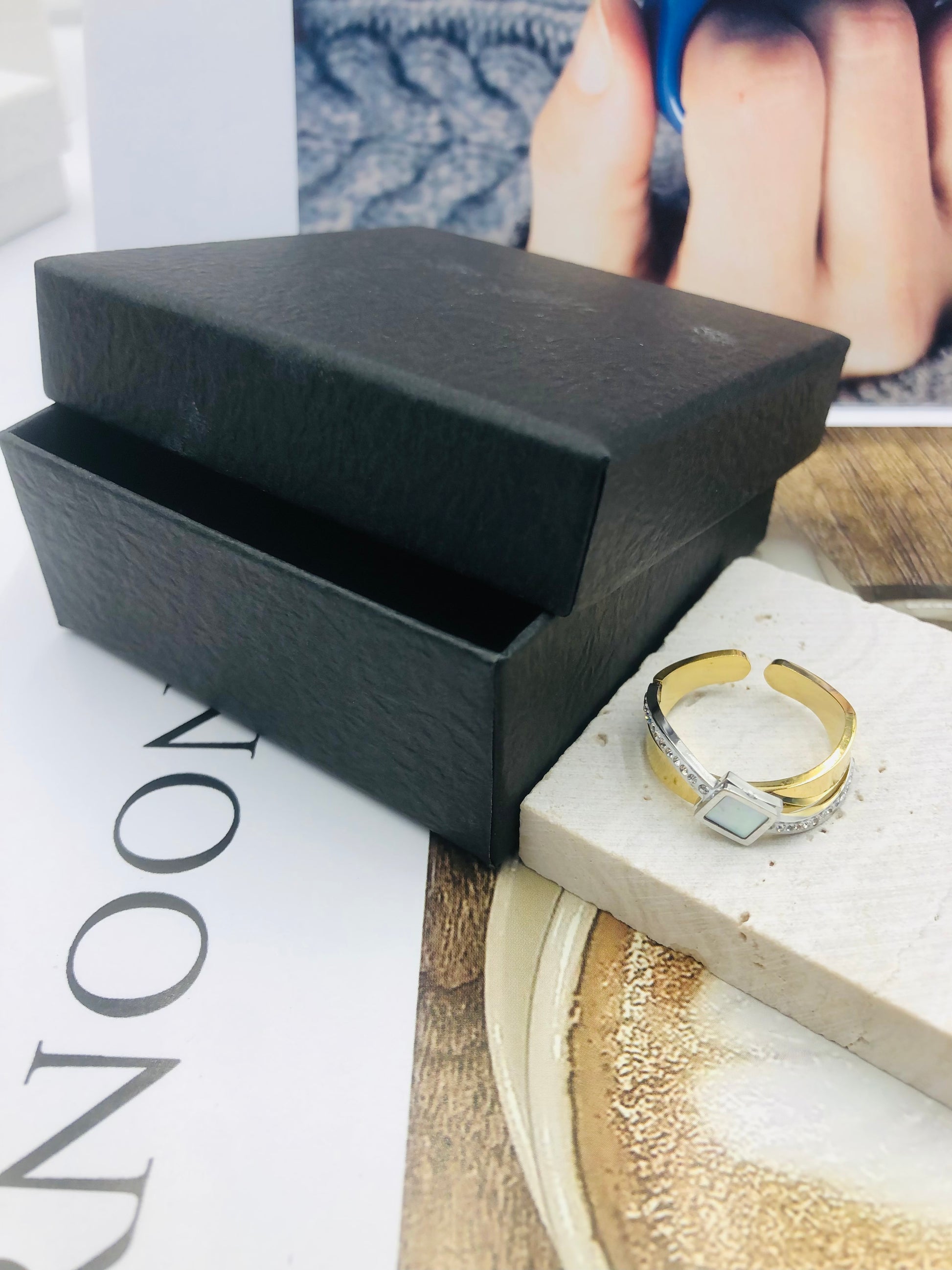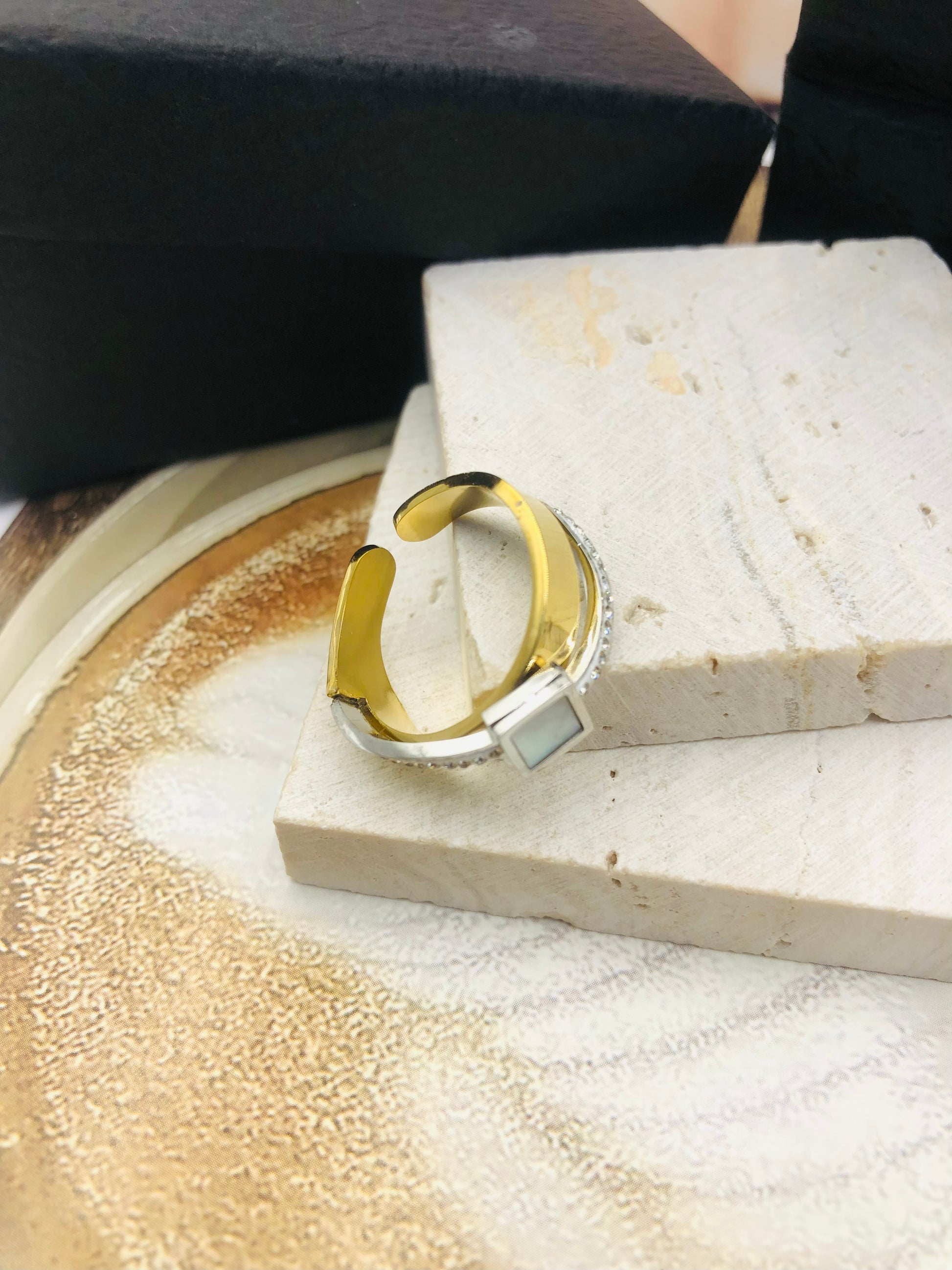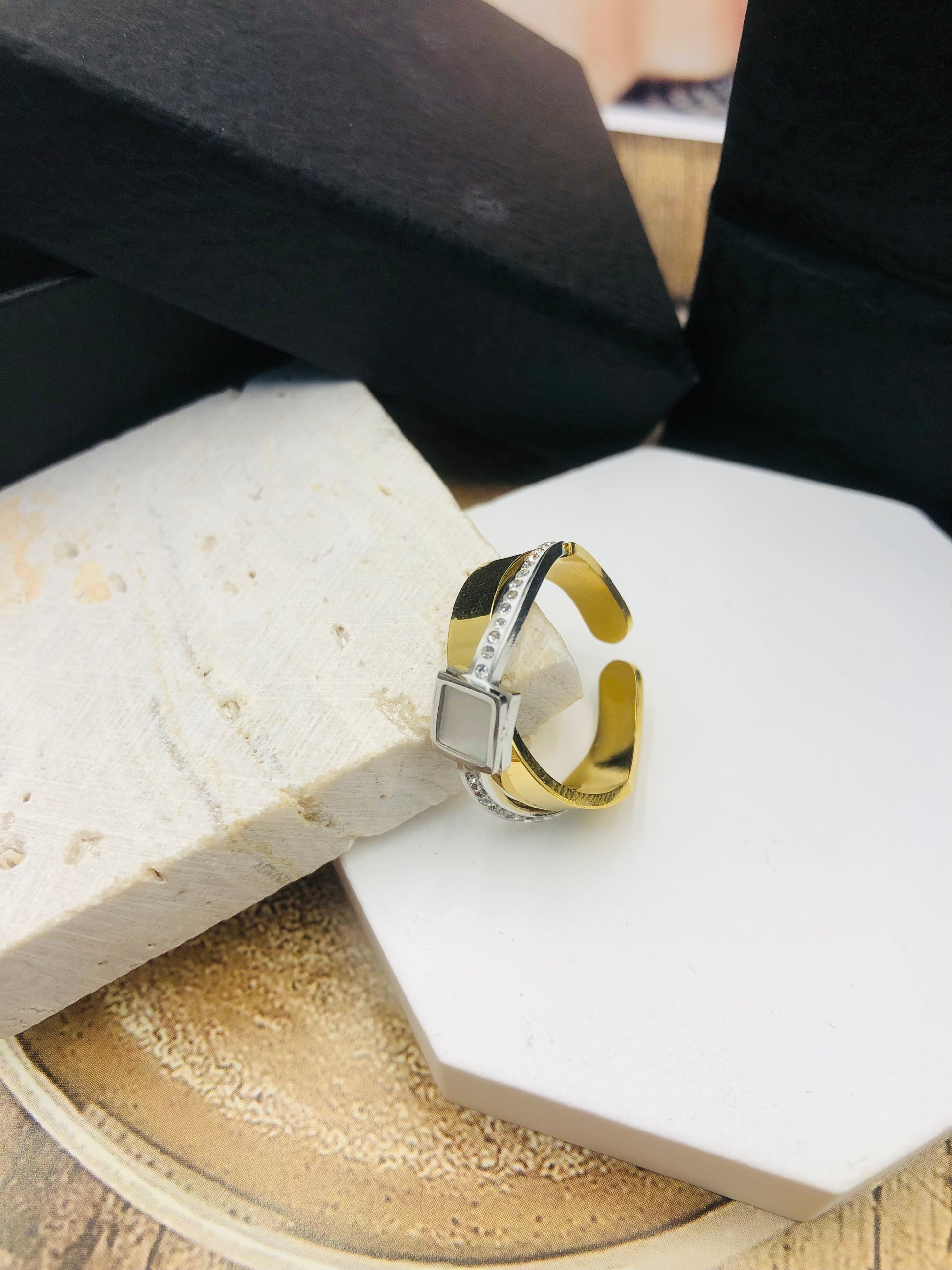 Shown exactly as captured! The Aura Glow Ring dazzles with its bold gold geometric design and shimmering gem accents, mirroring the image’s "A G" engraving and sleek metallic backdrop. ✨ Hypoallergenic alloy with scratch-proof polish—perfect for brunch dates, office glam, or stacking with other rings to level up any look!