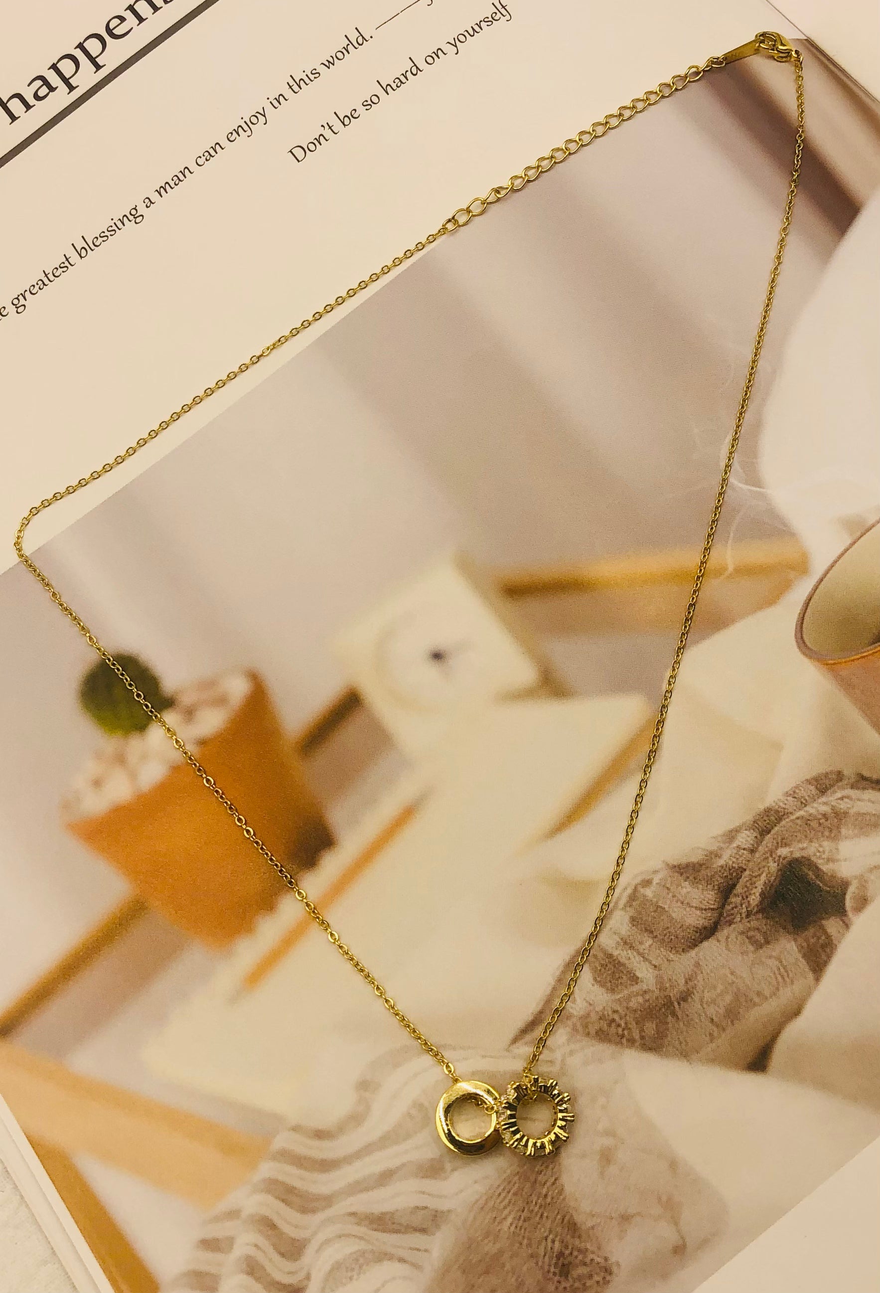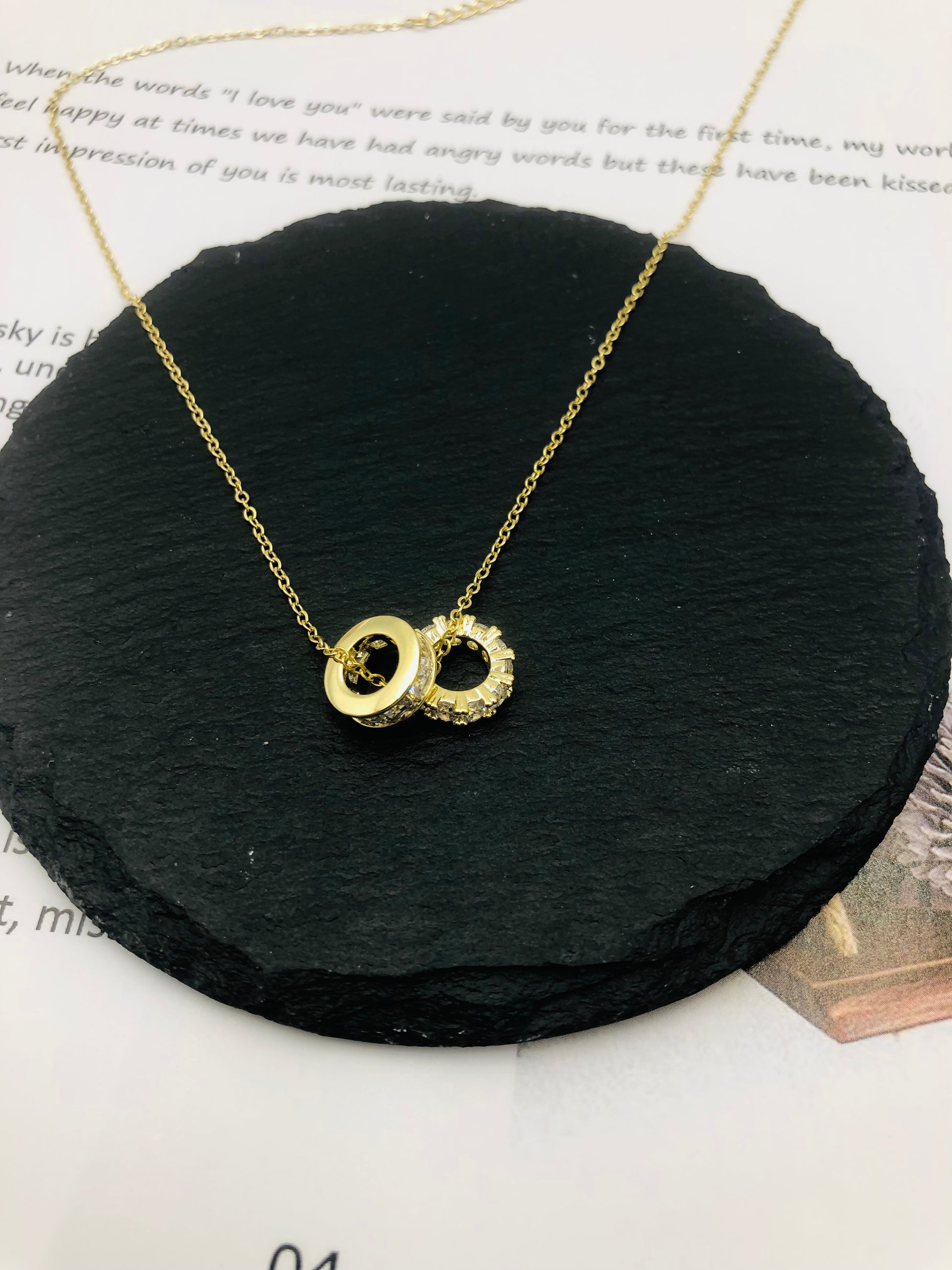 Captured exactly as shown! ⨠The âFirst Whisper Necklace glows against the imageâs dramatic black slate, featuring two intertwined gold rings dotted with diamonds that mirror the picâs scattered romantic text ("first time...kissed...lasting words"). Every glance whispers your love story!