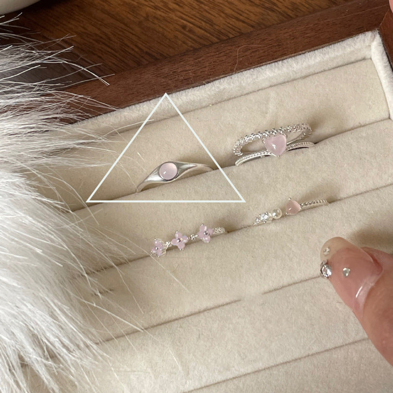 The image showcases a series of delicate rings from the Lumina Petal collection, artfully arranged on a soft, neutral-toned cushion. Each ring features a blend of rose-quartz pink accents and transparent crystalline elements, creating a harmonious balance between soft femininity and modern refinement. The designs are anchored by geometric precision, highlighted by a triangular framework that draws the eye to the intricate details. Set against a warm wooden backdrop, the juxtaposition of cool metallic silver and warm pink tones evokes a sense of timeless elegance with a contemporary edge