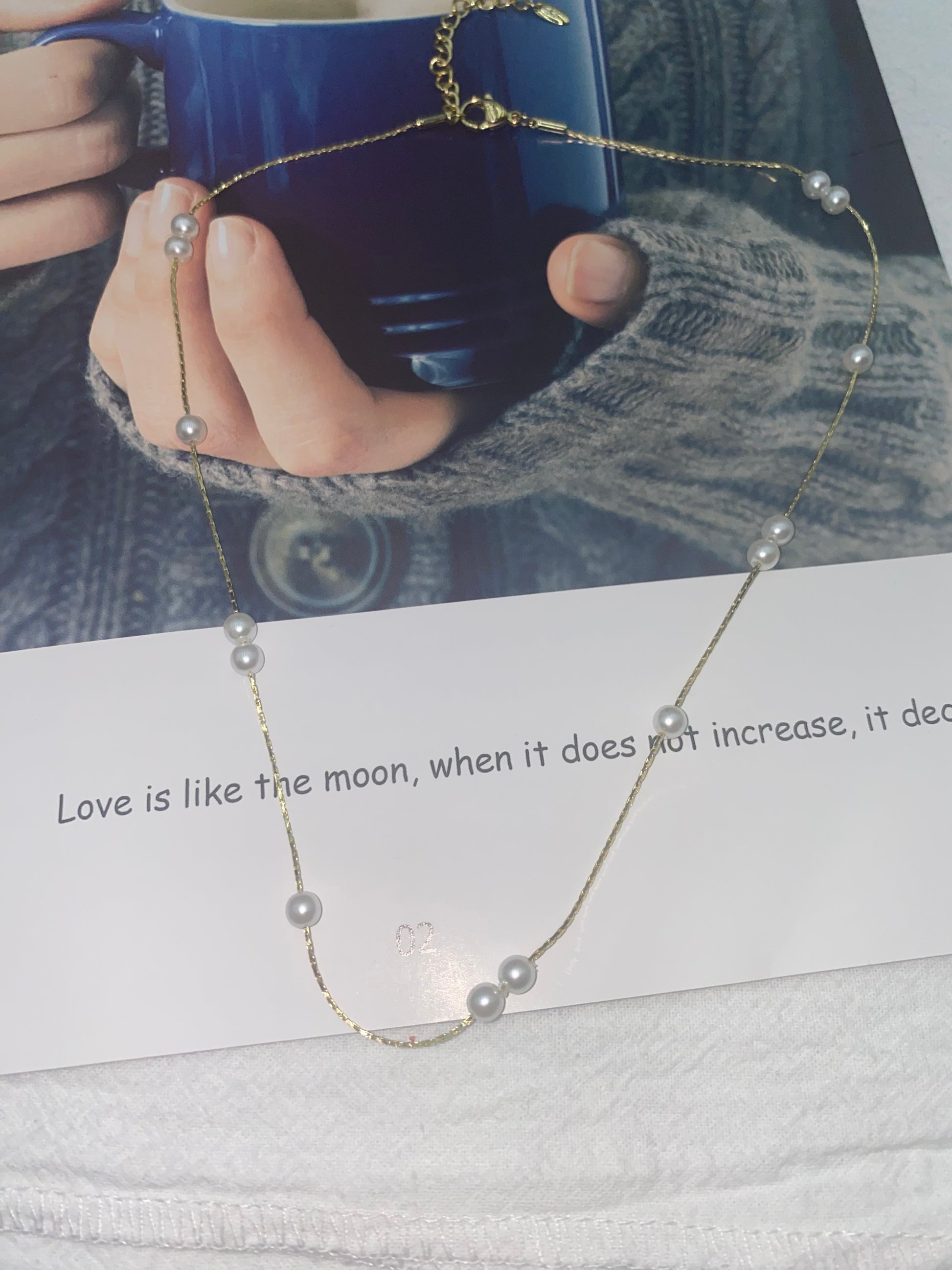 🌟 Photo-Exact Detailing: Polished pearls + gold chain curve (replicates the image’s textured backdrop and poetic "release, i decreases" card vibe!).
