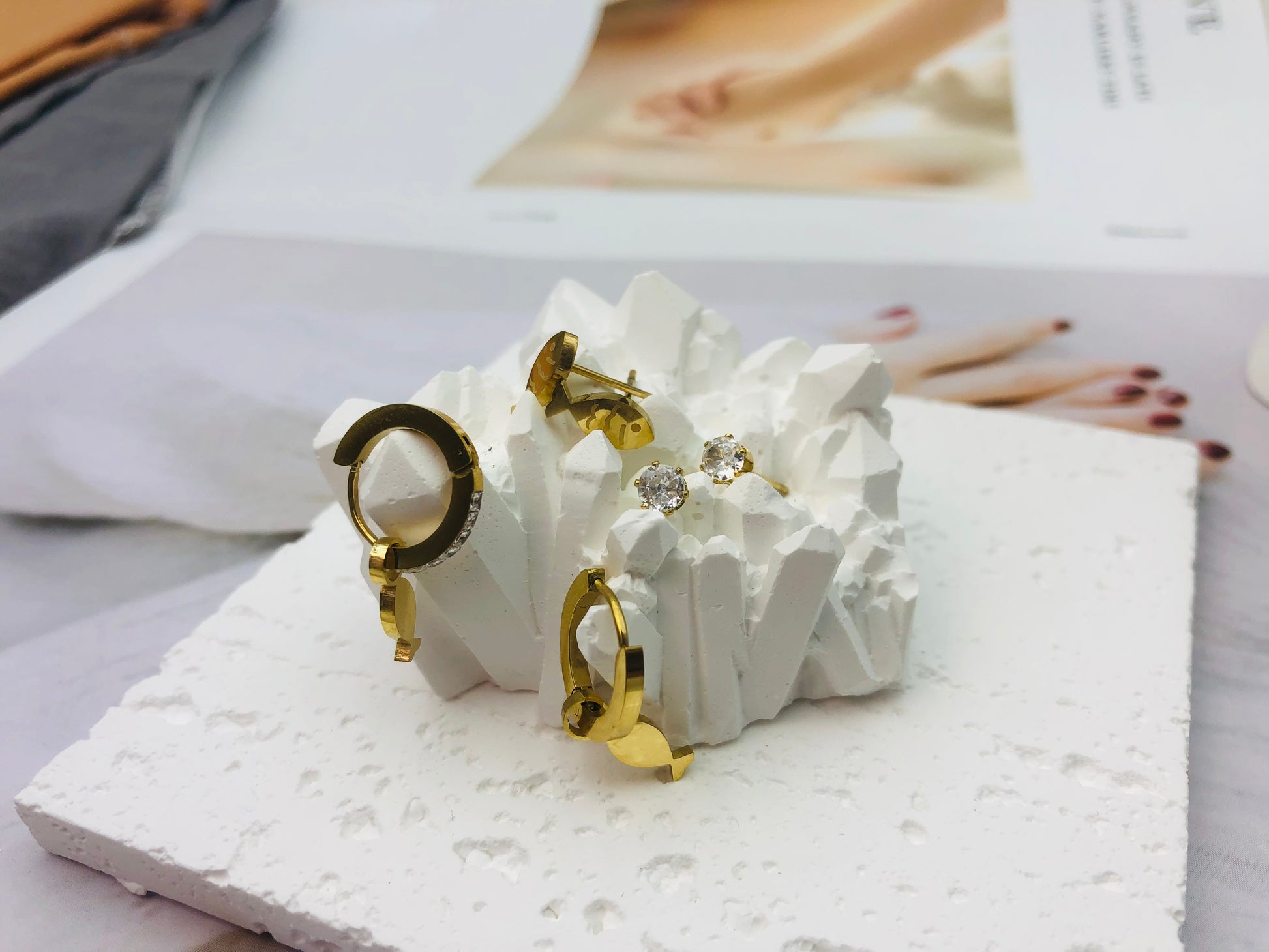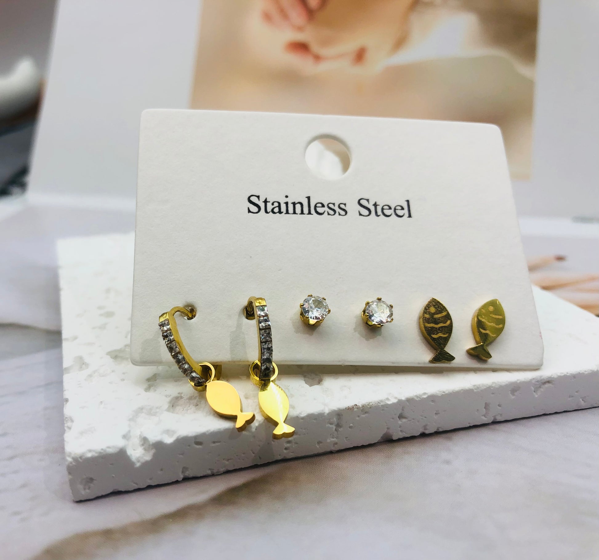 Matches the image perfectly! The Steel & Sparkle 6-Piece Earring Set delivers 6 stainless steel styles—from bold hoops with cubic zirconia sparkle to playful goldfish charms and minimalist crystal studs—all displayed on the sleek white cardstock stand (as shown!) against a textured stone backdrop. ✨ Mirroring the photo’s industrial-chic vibe, this collection mixes edgy shine with whimsical flair, perfect for stacking, gifting, or upgrading everyday looks!