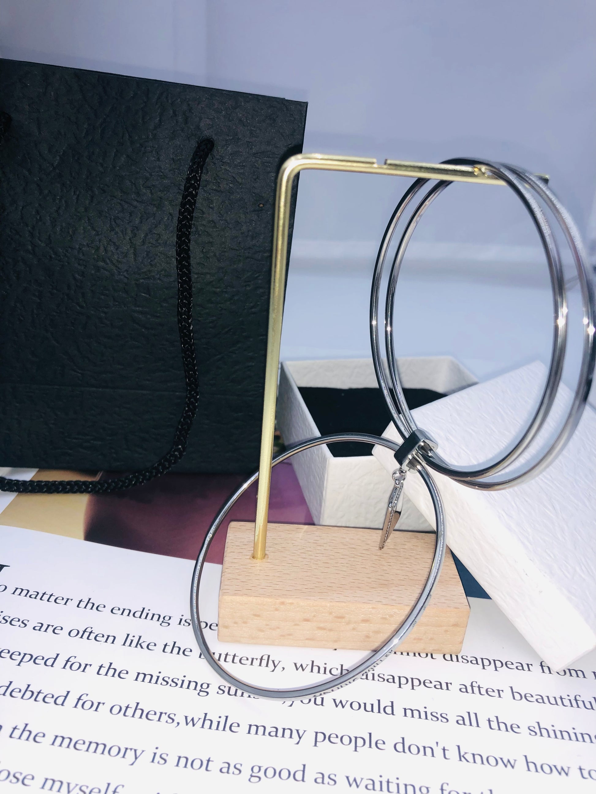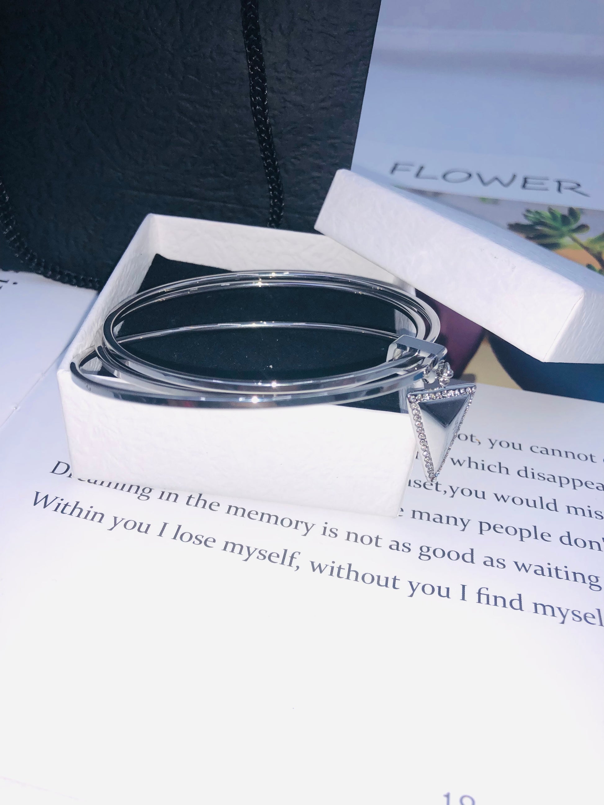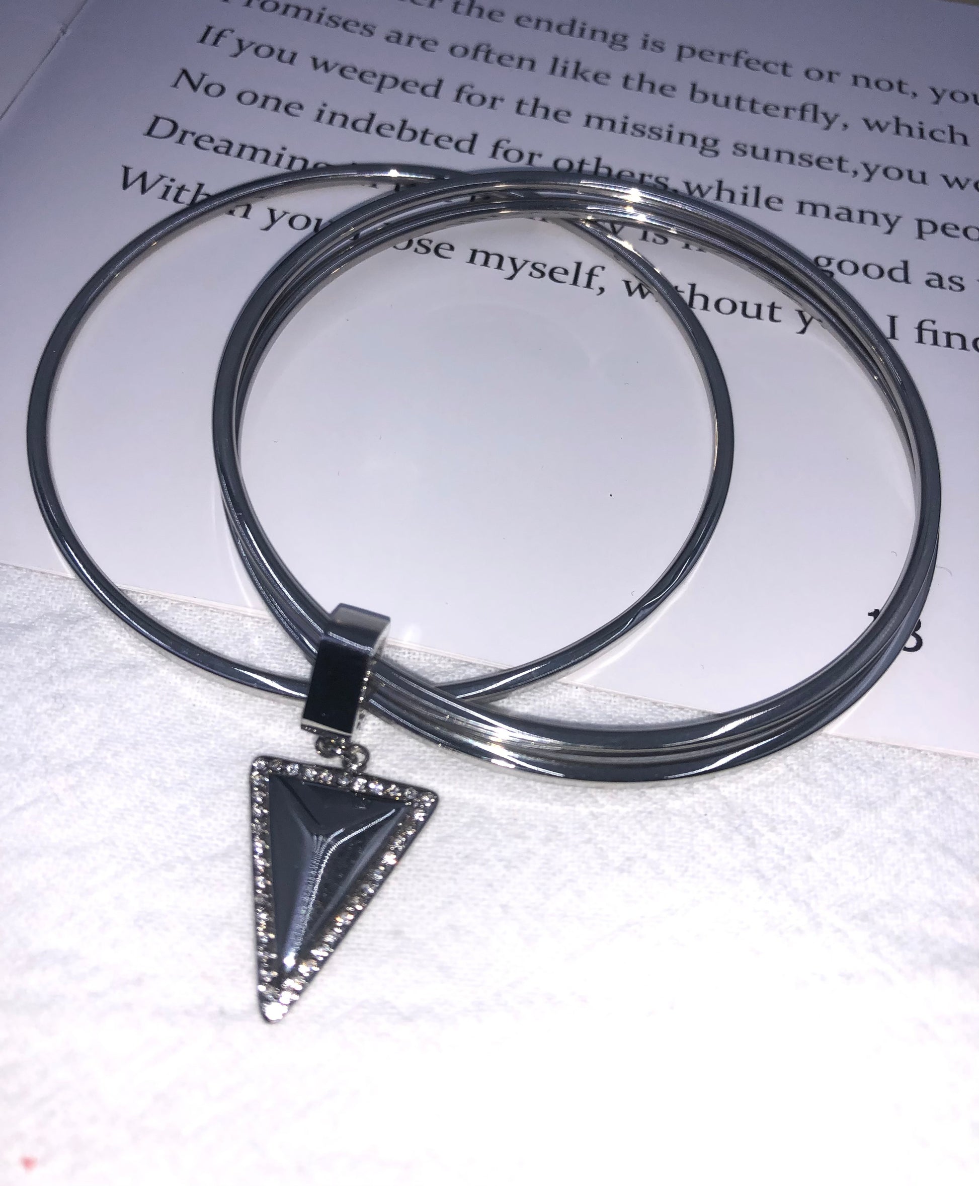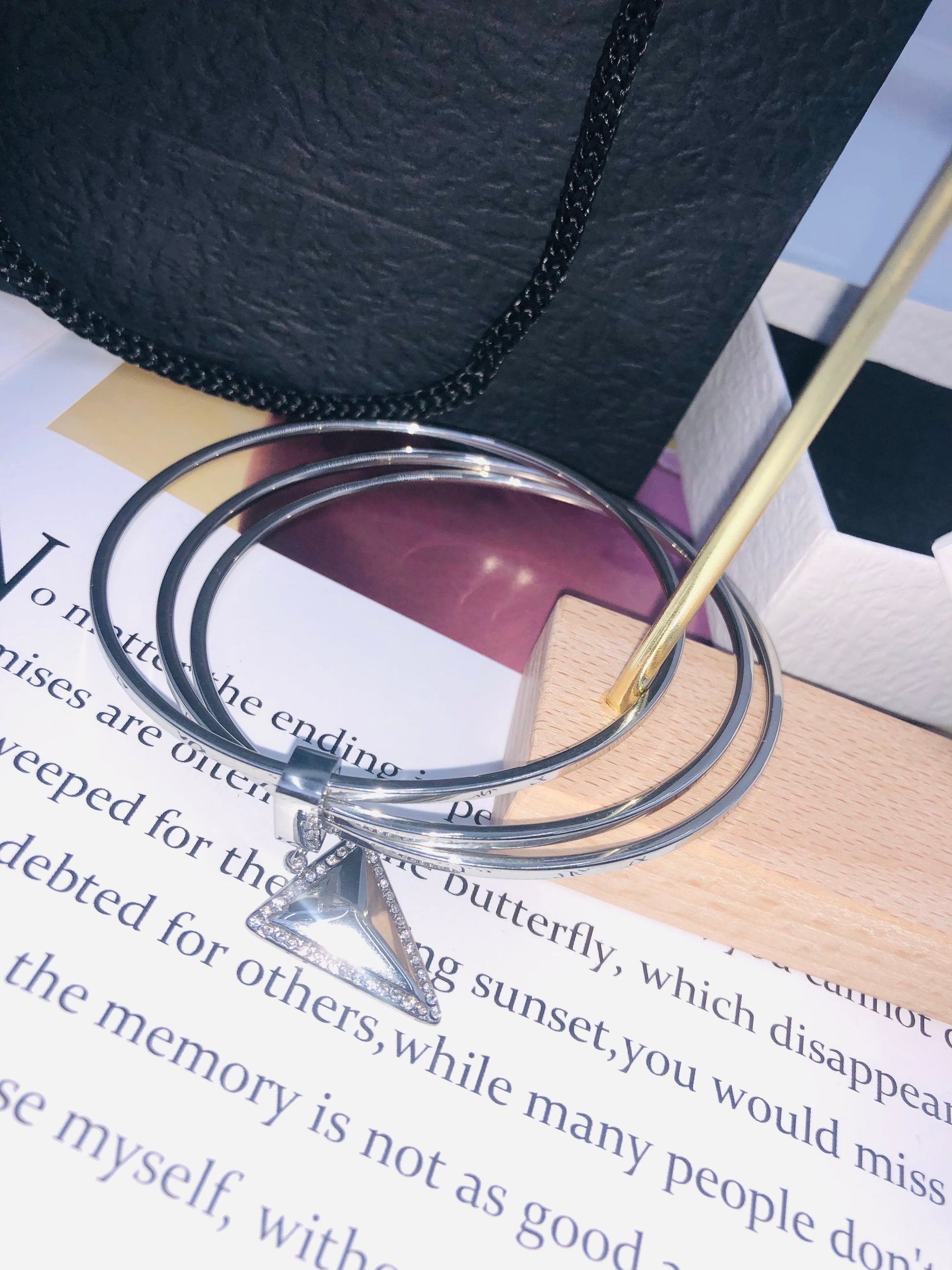 Matches the image perfectly! The Triple Glow Elegance Bangle Set features three sleek silver bangles with dazzling triangular pendants, each studded with shimmering crystal accents. ✨ Layered on a rustic wooden stand (as shown!), their metallic glow contrasts elegantly with the gold pen and poetic text backdrop—ideal for adding modern edge to any outfit!