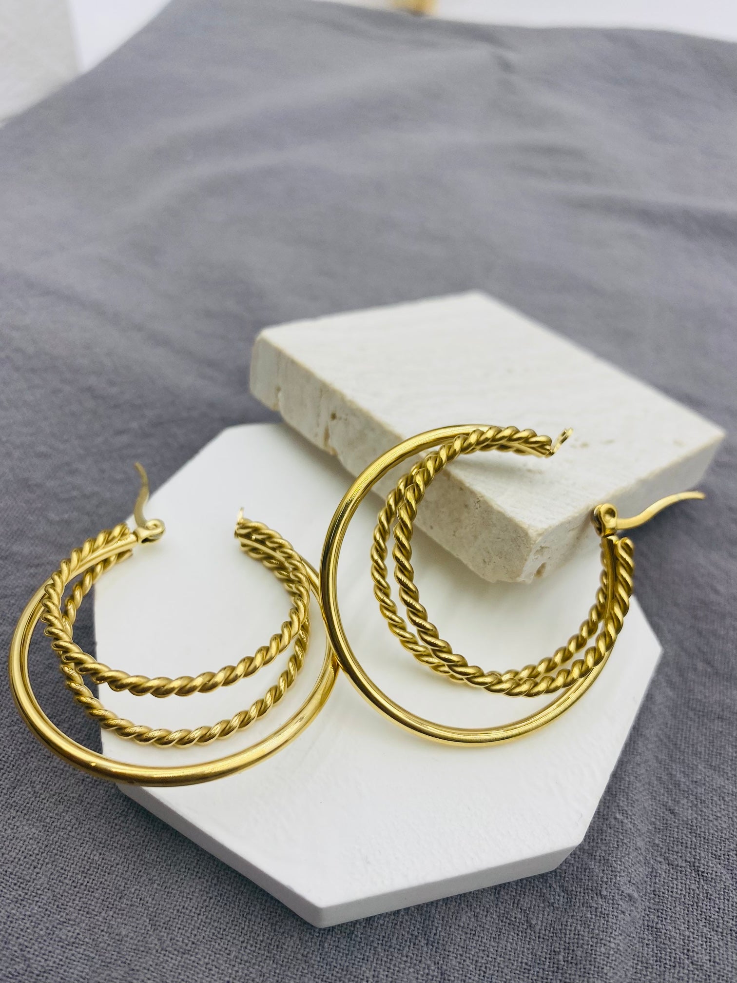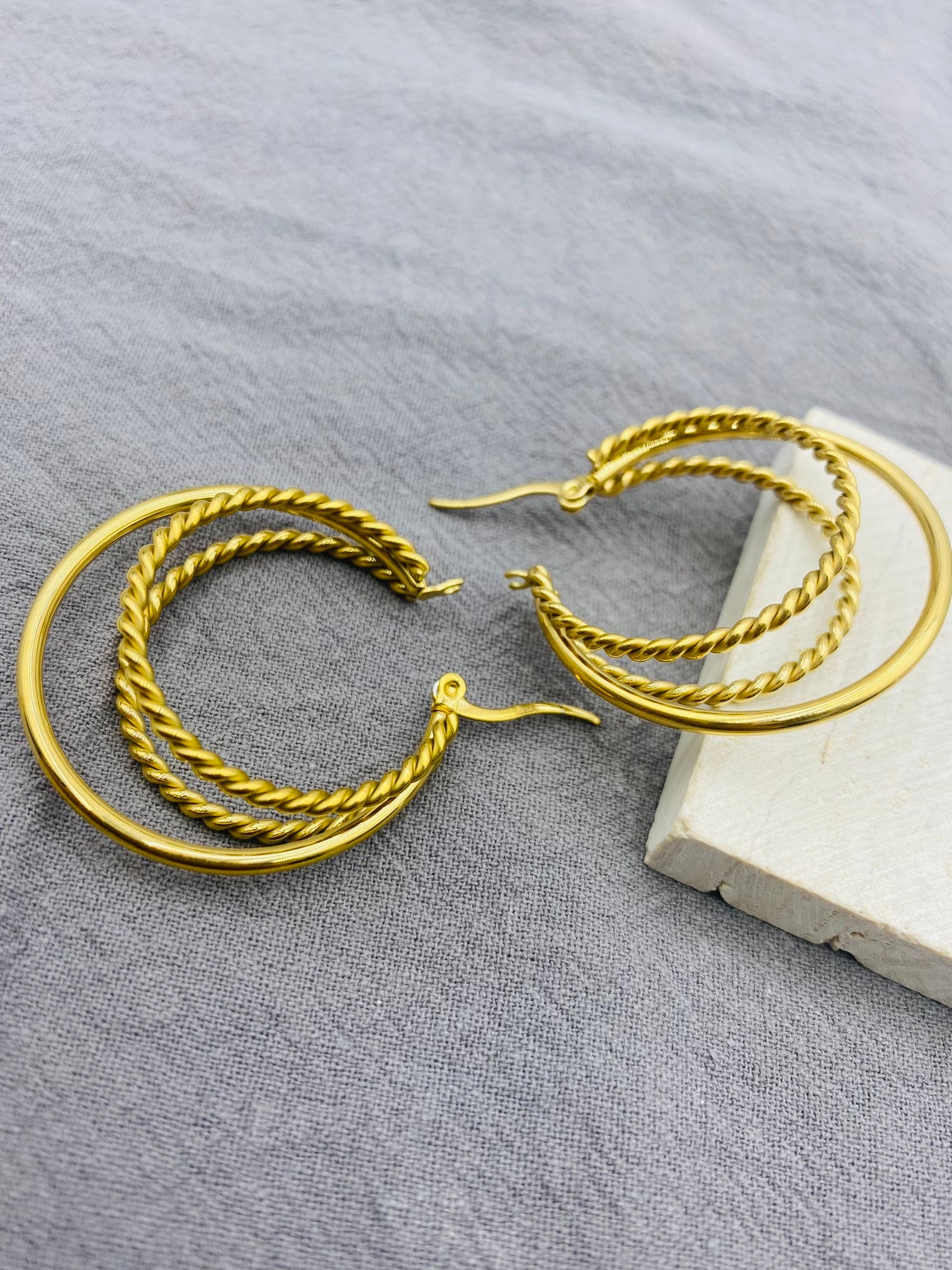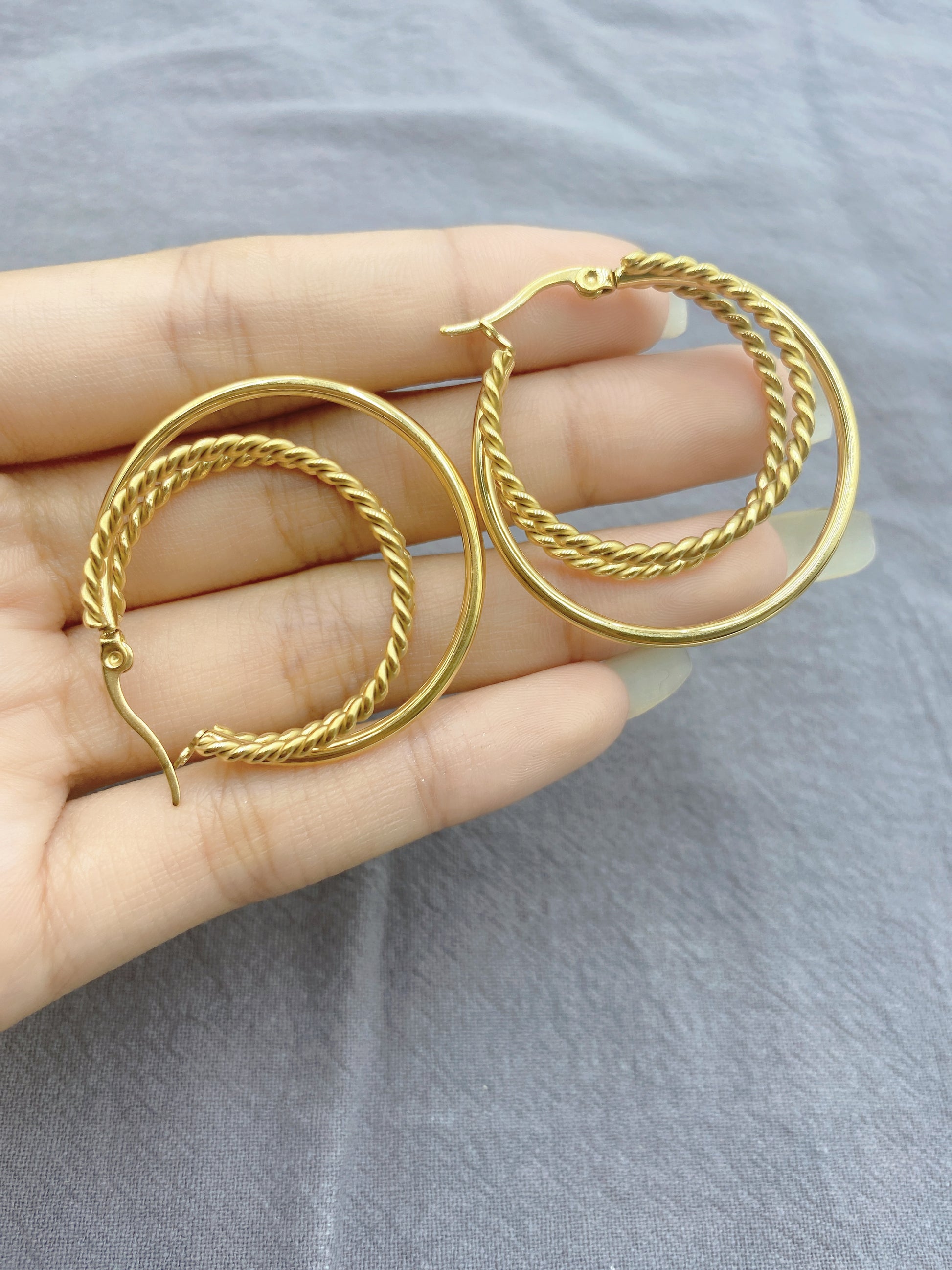 Shown exactly as captured! The Twisted Luxe Glow Hoops feature a stunning twisted gold design that blends classic elegance with modern edge, mirroring the image’s polished finish and textured backdrop. ✨ Hypoallergenic alloy + scratch-resistant polish ensure lasting brilliance—perfect for brunch dates, office glam, or adding bold flair to casual outfits!